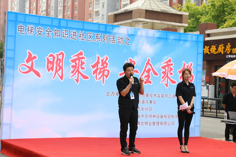 為迎接我國第十六個“安全生產(chǎn)月”, 6月17日上午9:00,由長春市質(zhì)量技術監(jiān)督局二道分局、會展街道辦事處、會展大街社區(qū)、吉林省中吉特種設備檢驗檢測有限公司、長春博文物業(yè)管理有限公司,在福臨家園小區(qū)共同舉辦電梯安全知識進社區(qū)之“文明乘梯 安全乘梯”宣講、電梯應急救援演練兩場活動。